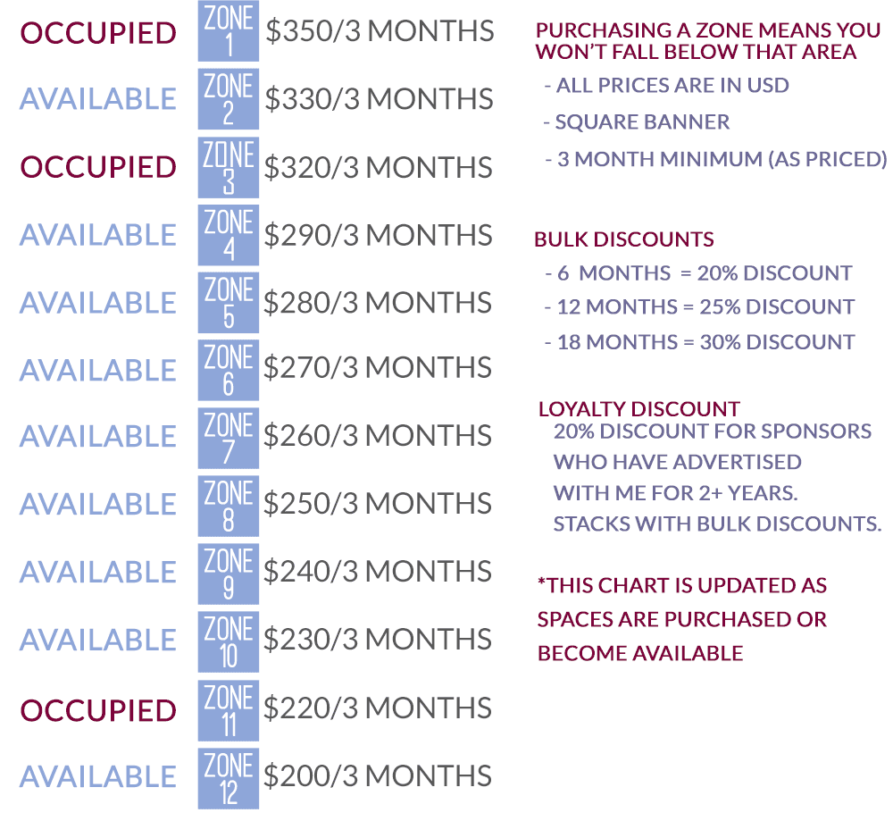 This is the current availability and pricing for the square banners that appear on my blog at all times in a “SPONSORS” section. Maximum visibility. Prices are subject to change.