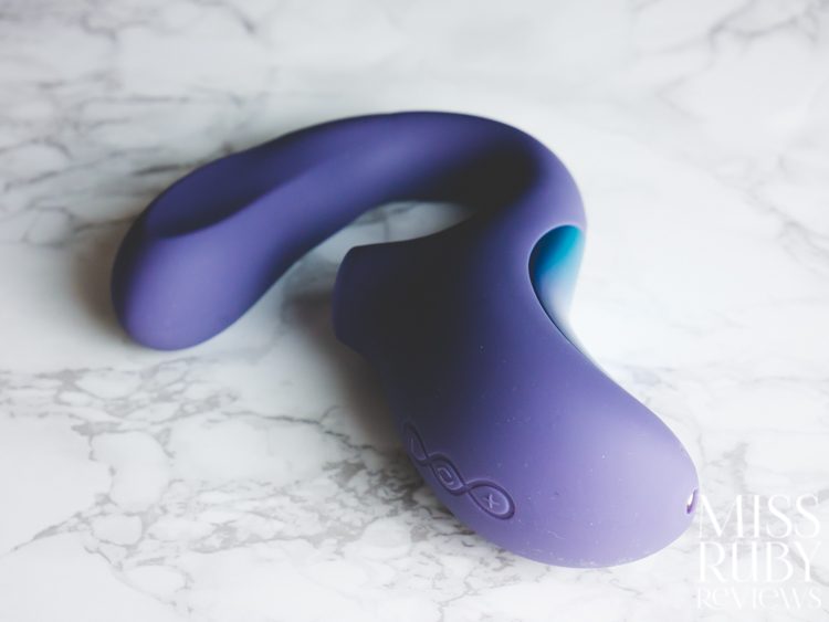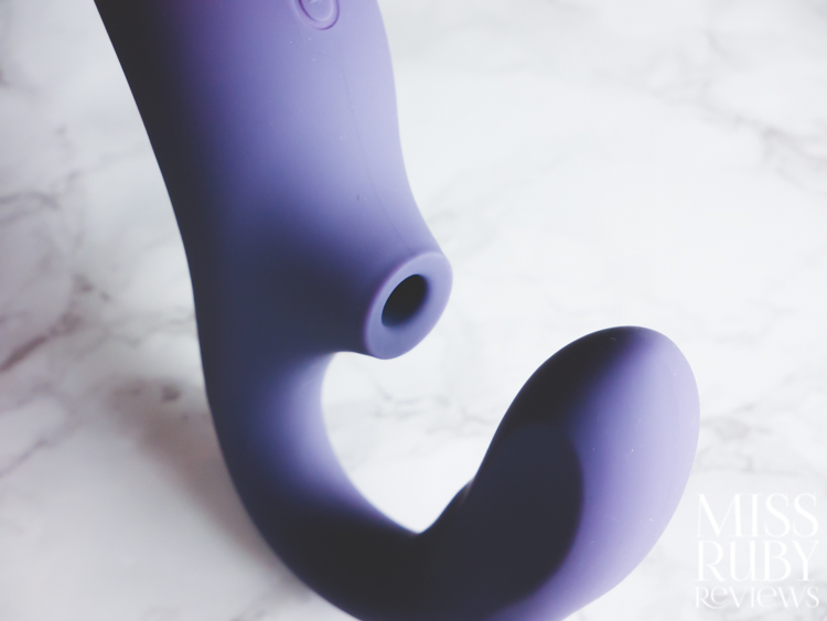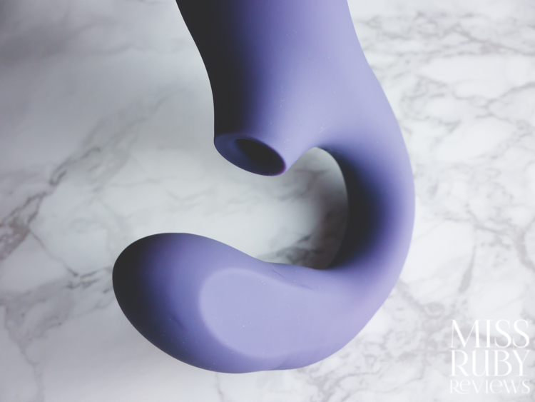 At first glance, the body reminded me of a LELO Sona — you’ve got a gently bulbus, gently curving handle with a suction mouth at the end. But then it quickly shifts into a U-shaped shaft — this part is G-spot insertable, and features both vibration and a waving motion.