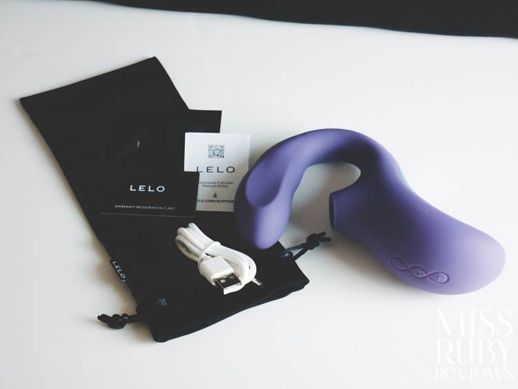 Inside the box, you receive the Enigma Wave, a black satin storage pouch, a white USB charging cable, a sample packet of LELO’s lubricant, a warranty card, and an instruction manual. The manual is also located online here.